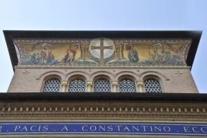 La chiesa è voluta da papa Pio X nel 1913 per celebrare i milleseicento anni dall’editto di Milano (313 d.C.) con cui l’imperatore Costantino concesse piena facoltà di culto alla chiesa cattolica, l’editto di Costantino, uno dei più famosi falsi nella storia. Il luogo fu scelto perché si riteneva che lì le armate di Costantino, procedendo verso la città dopo la vittoria contro Massenzio, superato Ponte Milvio, avessero suonato le loro trombe per annunciare alla città la fine delle ostilità.