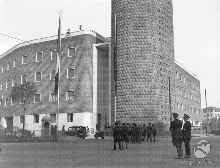 Di conseguenza, l’edificio del comando generale della MVSN è certamente luogo di lavoro ma soprattutto deve essere un chiaro simbolo della forza del regime. Anche se può sembrare incredibile per gli standard odierni, la progettazione di questo edificio così importante è affidata a Vittorio Cafiero, giovane architetto allora poco più che trentenne (nei decenni successivi lascerà molti importanti segni nella città, dal palazzo della FAO al Villaggio Olimpico). Il risultato si inserisce pienamente nel gusto dell’epoca; il nuovo edificio (inaugurato il 26 giugno 1936) ha l’ingresso monumentale su via Scipio Slataper ed è caratterizzato fortemente da una imponente torre (ben visibile arrivando da piazza Ungheria) che ospiterà il sacrario dei caduti della “rivoluzione fascista” decorato con i grandi mosaici di Angelo Canevari.